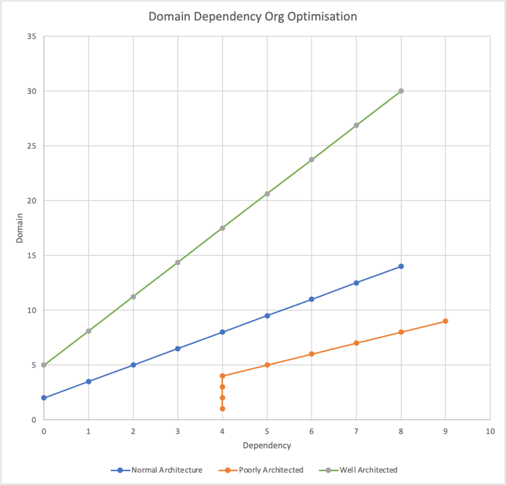 If you look at the anecdotal graph below you can see the relationship between domain / scope and dependency. This graph shows you that as you reduce domain you reduce dependency. Put simply, the lower your dependancies them more “federated” your organisation and the more domain your staff have the more “centralised” your organisation is.