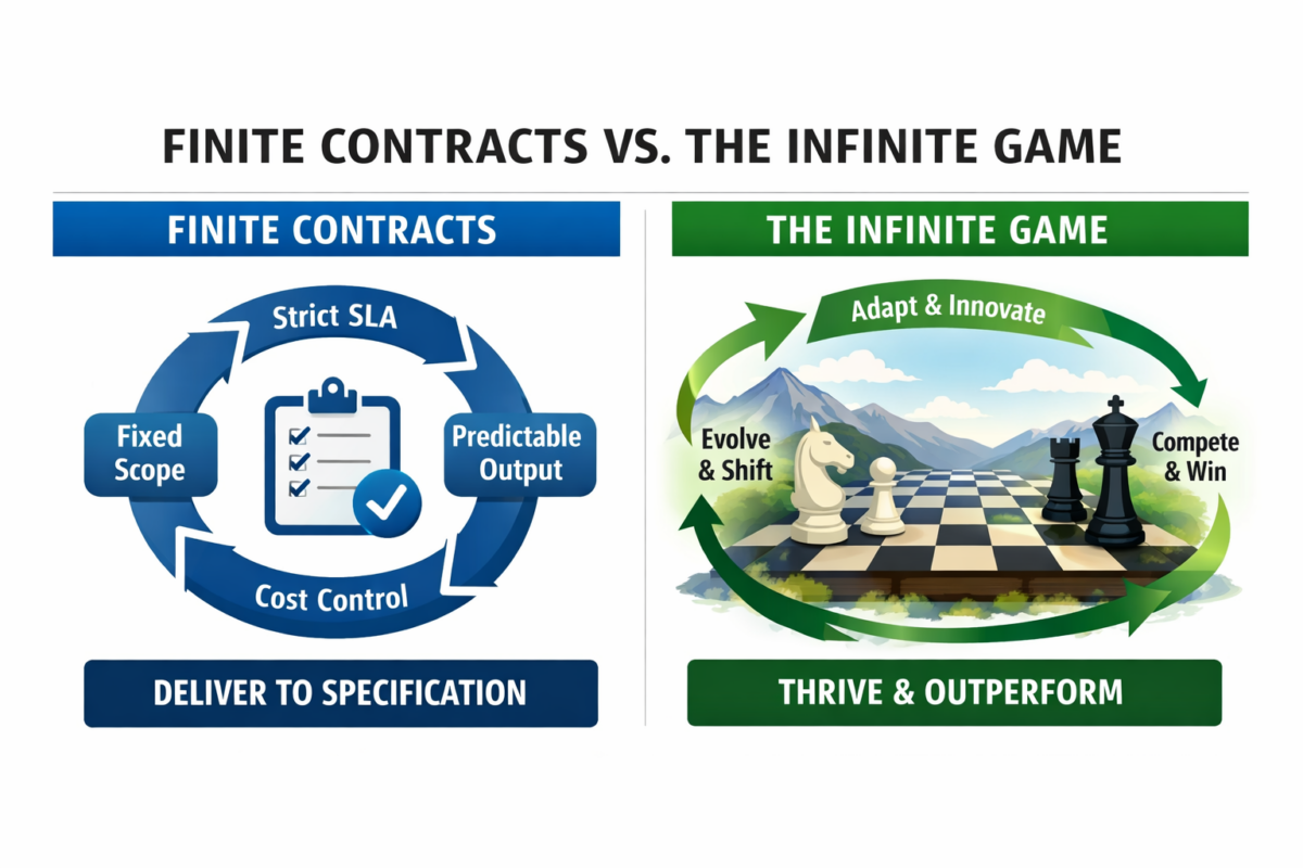 Outsourcing is fundamentally a finite game. It is about grinding every last cent out of a well defined specification. It is about predictability, cost control and contractual certainty. Those are not bad things in isolation. Competition, however, is infinite.
