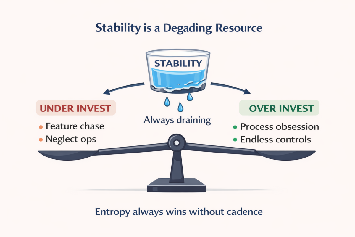 Stability is not something you believe in. It is something you operationalise. And if you do not embed it mechanically, entropy will do the embedding for you.