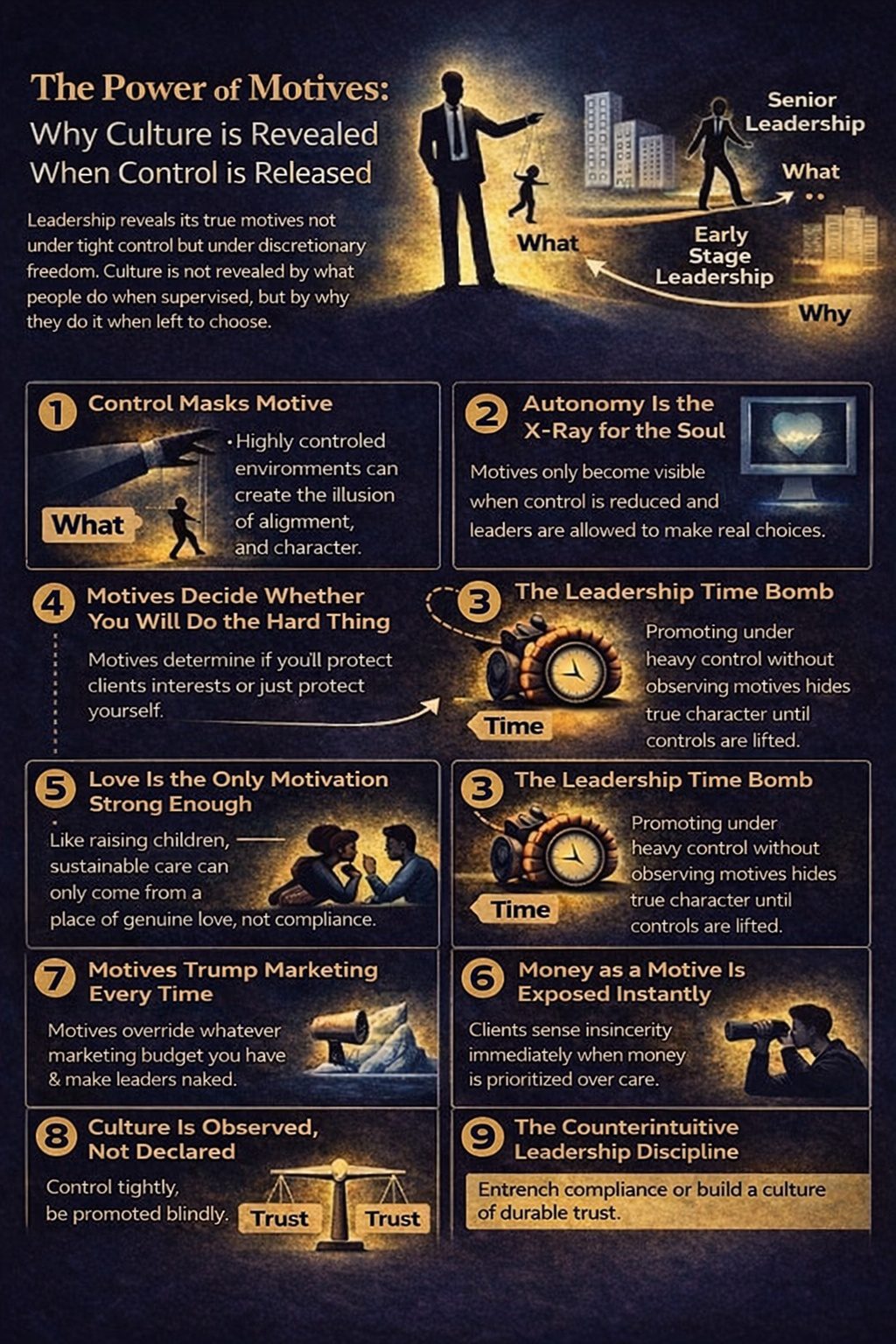 There is a common pattern that quietly destroys organisations. Juniors operate under heavy control. Motives are never observed. Promotions happen based on execution under constraint. Then, at seniority, controls are removed and behaviour suddenly changes. Leadership is shocked.
