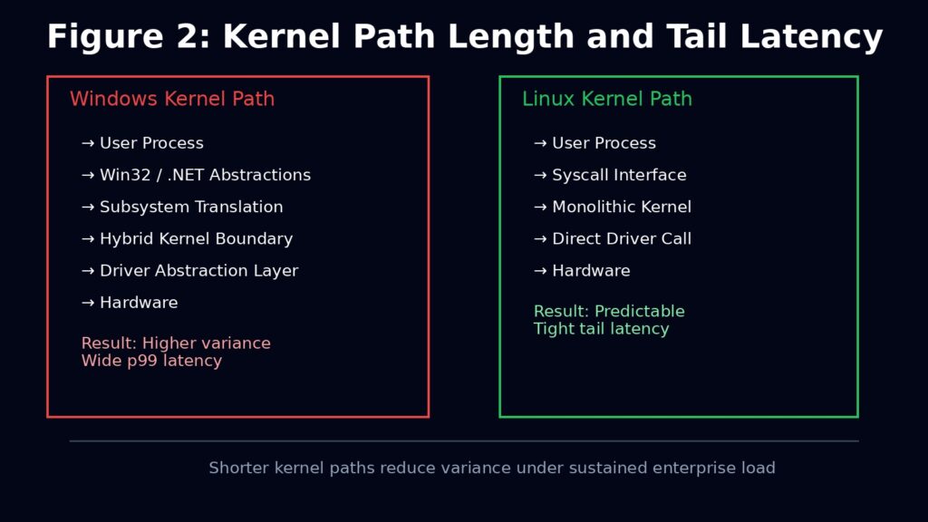 The result is not lower average performance, but wider tail latency. In enterprise systems, tail latency is what breaks SLAs, overloads downstream systems, and triggers cascading failures. Linux kernels are routinely tuned for single purpose workloads precisely to collapse that variance. Windows kernels are generalised by design.