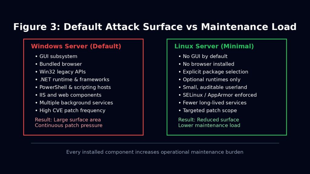 A Windows server often ships with a GUI, a browser, legacy subsystems, and optional features enabled by default. Each of these components must be patched, monitored, and defended whether they are used or not.