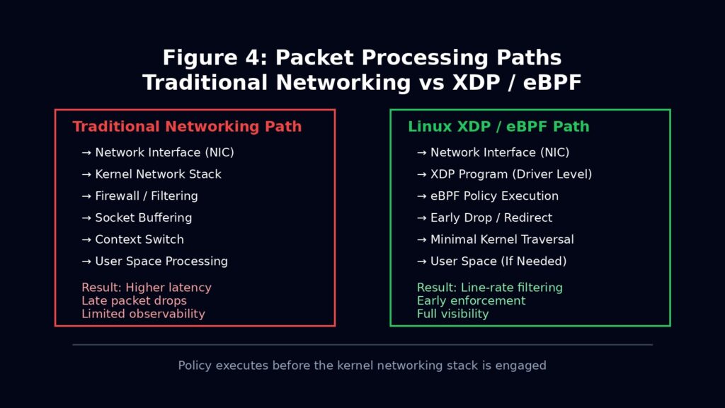 Linux treats the kernel as a programmable execution environment. With XDP and eBPF, packets can be inspected, redirected, or dropped before they meaningfully enter the networking stack. This allows DDoS mitigation, traffic shaping, observability, and enforcement at line rate.