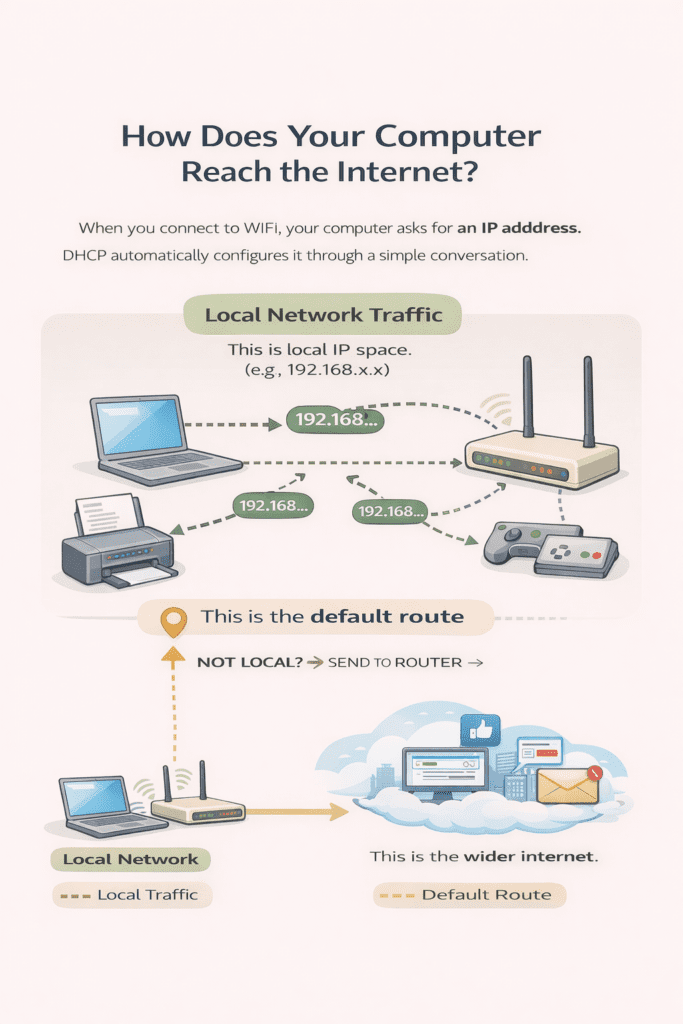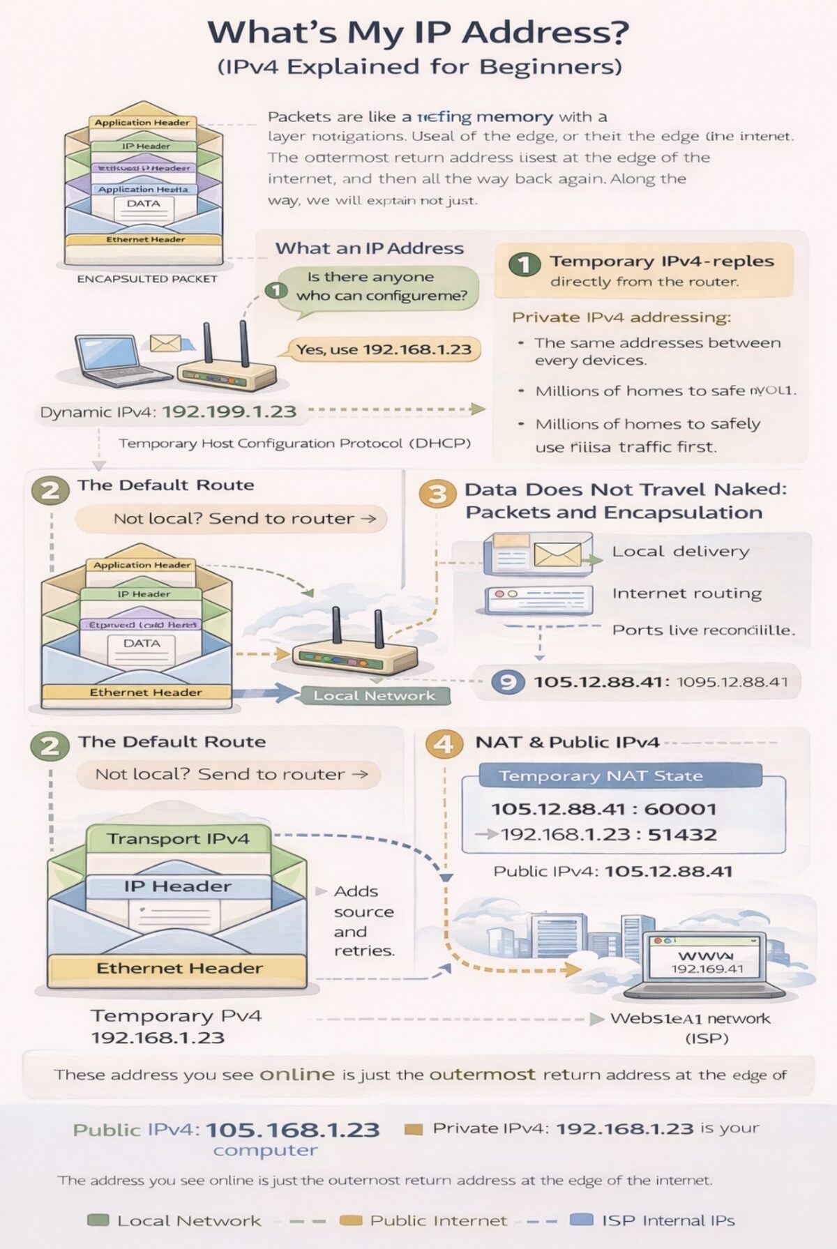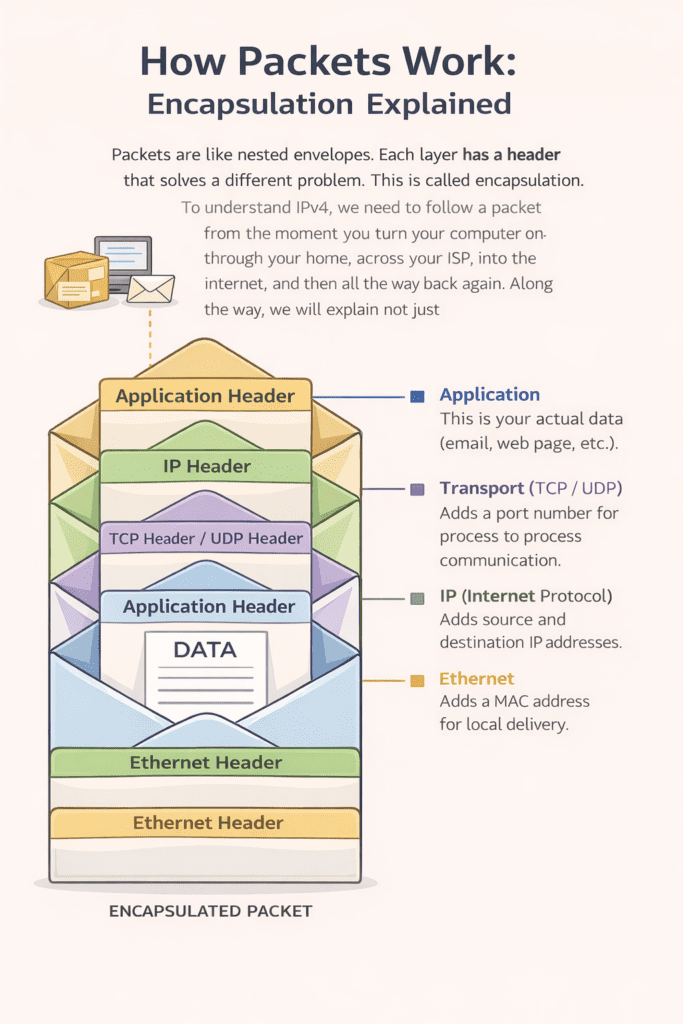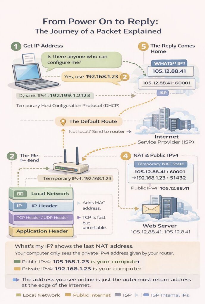 To understand IPv4, we need to follow a packet from the moment you turn your computer on, through your home network, across your ISP, into the internet, and then all the way back again. Along the way, we will explain not just what happens, but why it works this way.