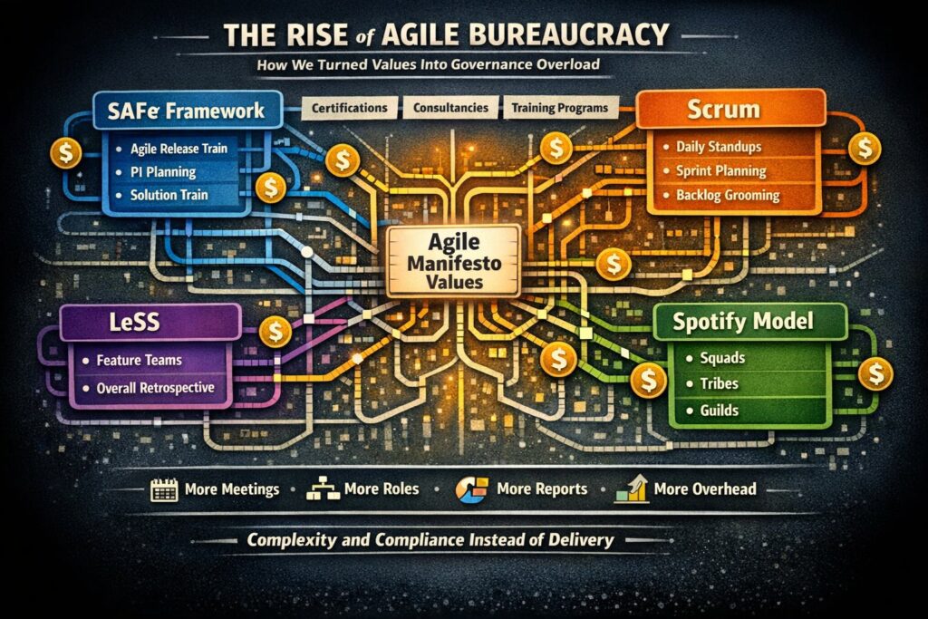 The Agile Manifesto was never a methodology. It was a set of values. But values do not sell consulting hours, certifications, or operating models. Frameworks do.
