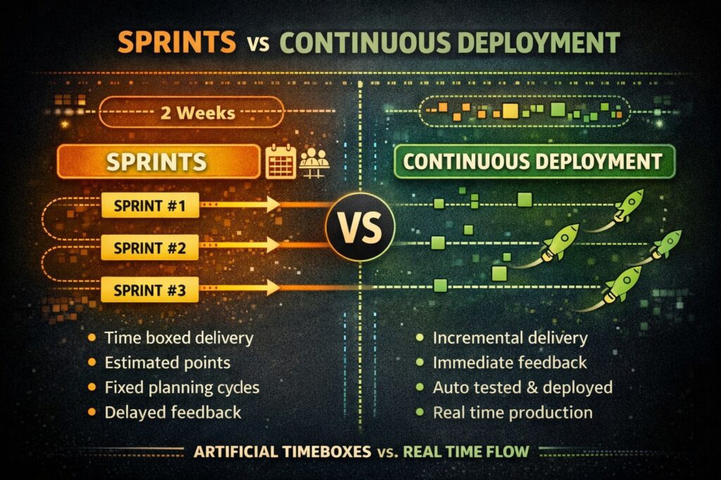 Continuous deployment forces discipline where it matters: in code quality, test coverage, and system design. It removes the need for most Agile theatre because progress is visible in production, not on a board.