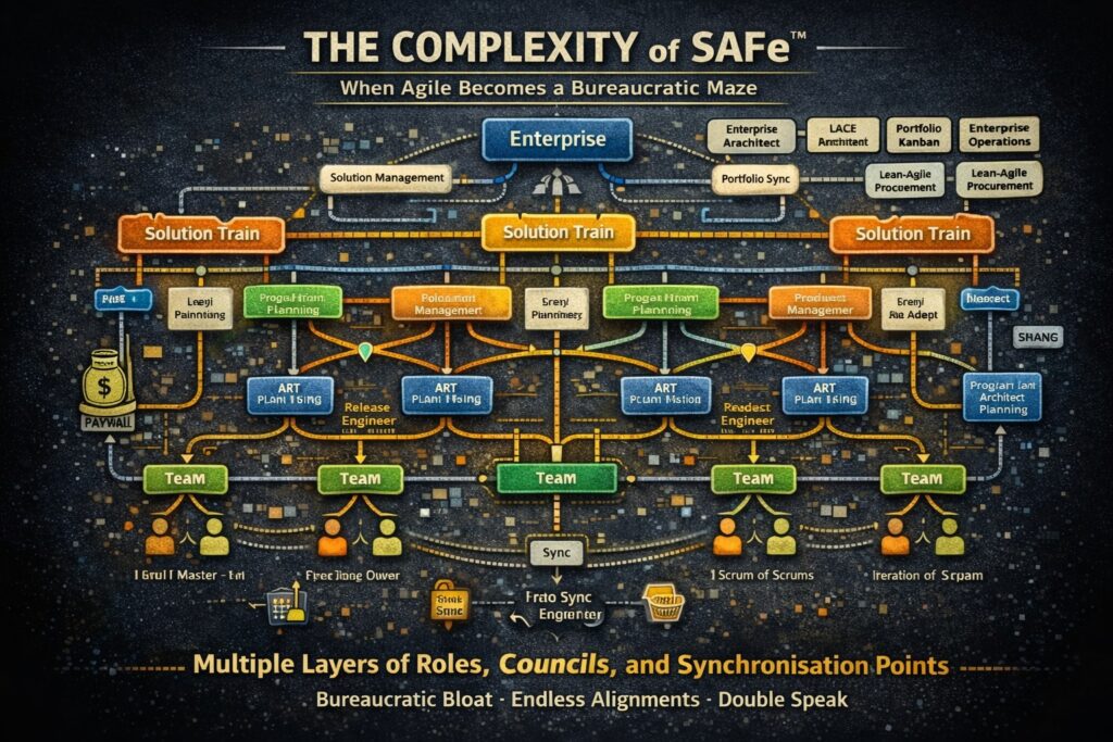 The framework did not simplify. It did not converge. It did not correct course. It expanded. More roles. More layers. More artefacts. More synchronisation points. Every release claims to “reduce cognitive load” while aggressively increasing it.