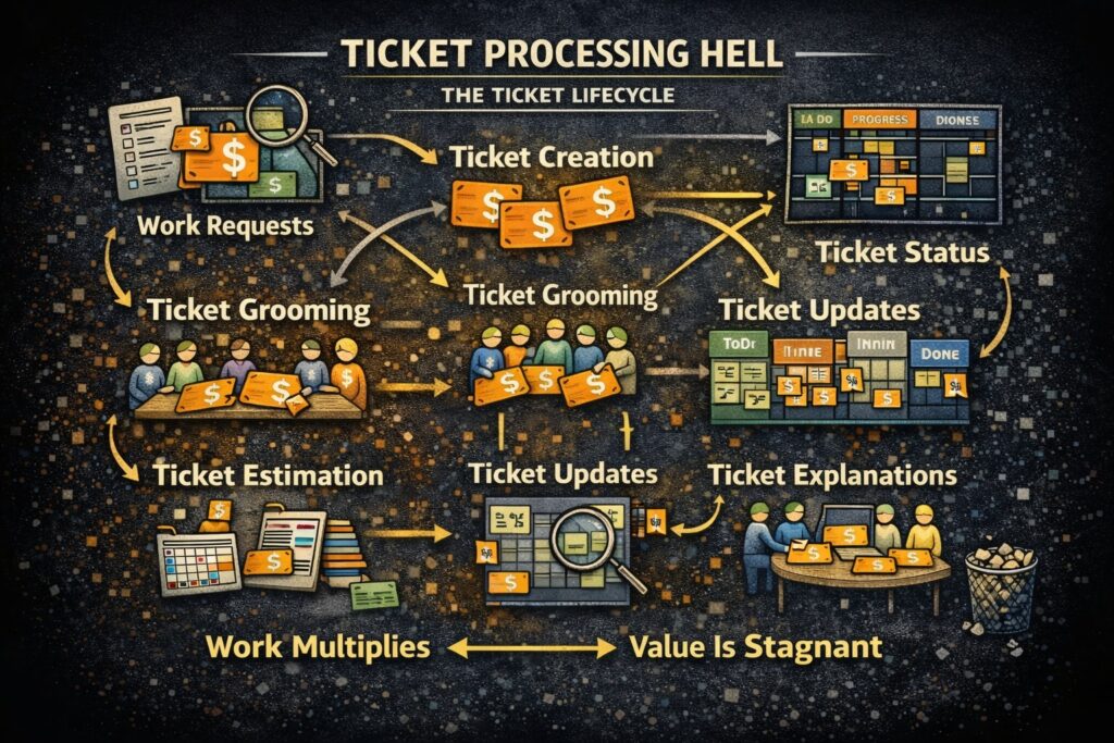 Engineers spend an extraordinary amount of time creating tickets, grooming tickets, estimating tickets, updating ticket status, and explaining why tickets moved or did not move.