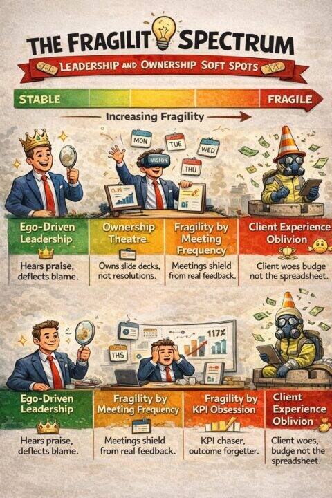 Fragile leaders need private consensus. They need side rooms, pre meetings and alignment calls to protect their image before engaging in the real conversation. They cannot say, “Sorry, I think I may have duffed this one.” So instead, they diffuse accountability, soften language and drain urgency from execution.