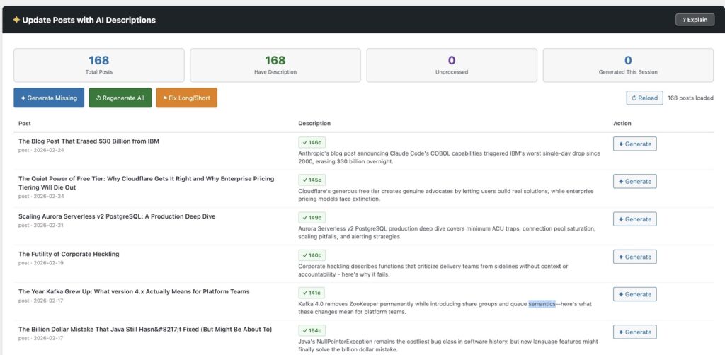 You’ll see a count of your total posts, how many have descriptions, and how many are still unprocessed. Click Generate Missing to kick off a batch run. The plugin processes posts one at a time, logging each one in the terminal style display as it goes. For a site with 150–200 posts, expect it to take a few minutes.