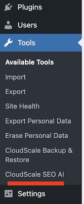 The plugin appears in your admin sidebar under Tools → CloudScale SEO AI.