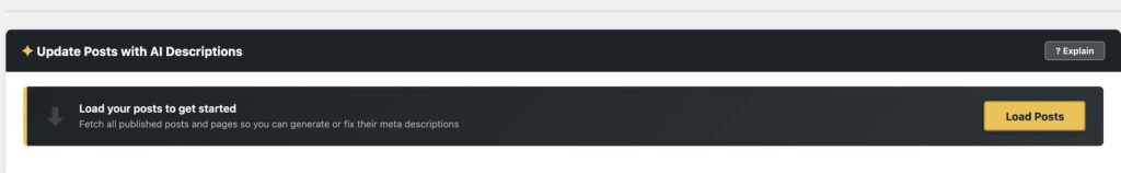 Once your API key is saved, go to the Optimise SEO tab and scroll to the Update Posts with AI Descriptions card. The click “Load Posts”: