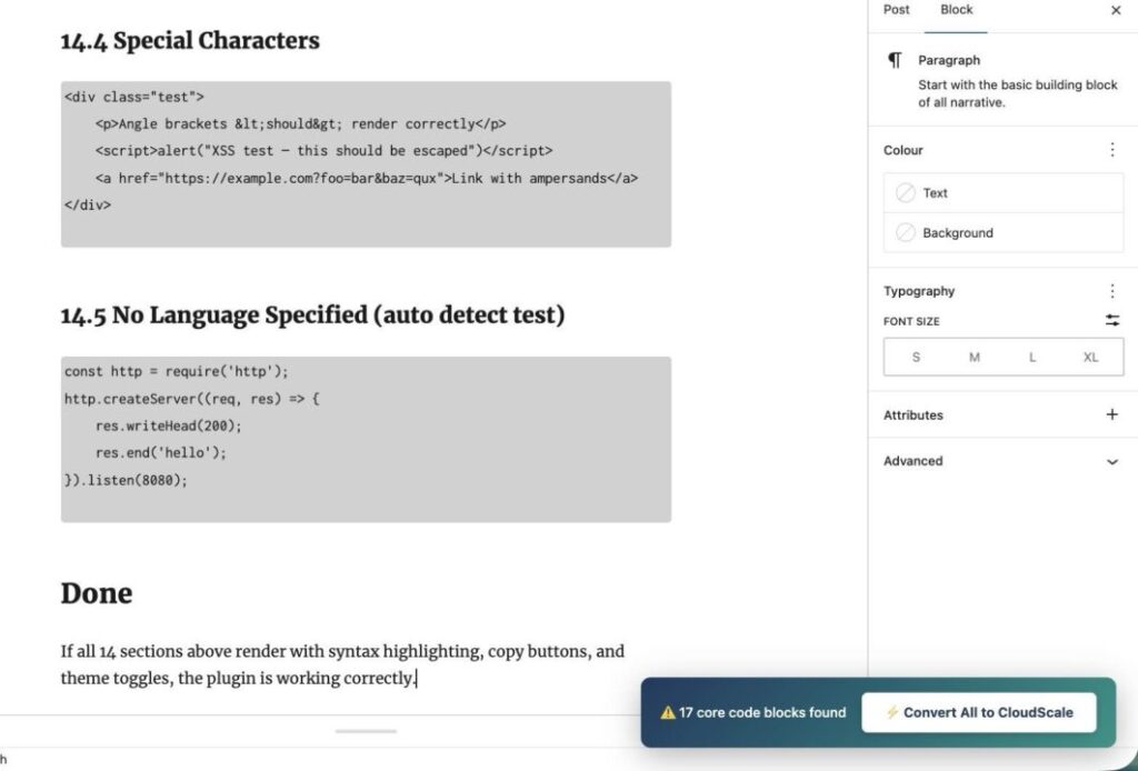 Click the Convert All to CloudScale button and every core/code and core/preformatted block in the post is instantly replaced with a CloudScale Code Block. The code content is preserved exactly as it was, and highlight.js will auto detect the language on the frontend.