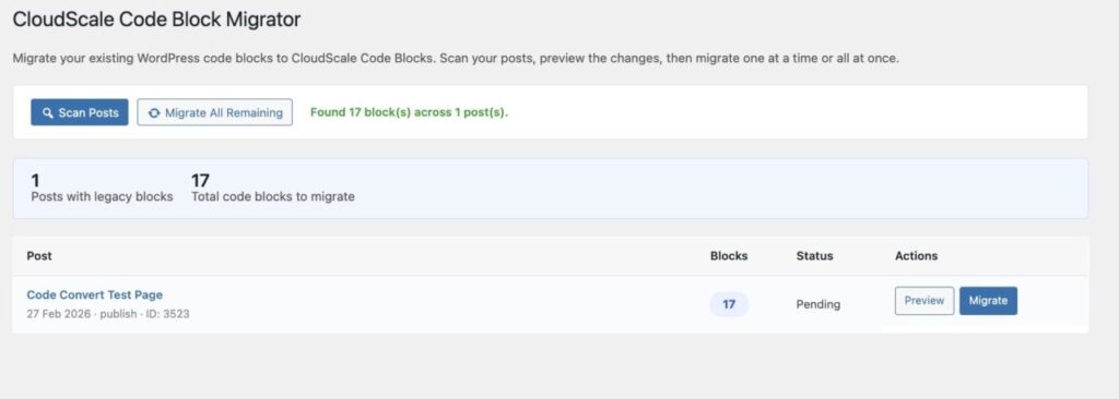 If you have an existing blog with dozens or hundreds of posts using WordPress’s default code blocks or the Code Syntax Block plugin, you don’t want to edit each post manually. CloudScale Code Block includes a built in migration tool that handles this in bulk. Once the plugin is activated, go to Tools > Code Block Migrator in your WordPress admin.