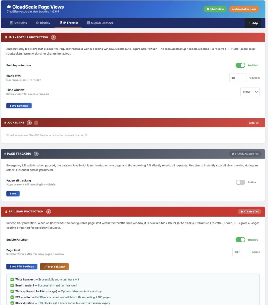 IP throttle protection limits how many views any single IP address can generate within a rolling window. The default is 50 requests per hour. After that threshold, subsequent requests are silently accepted (the attacker gets no signal that they have been blocked) but not recorded. Blocked IPs automatically unblock after one hour. There is no permanent blocklist to manage.