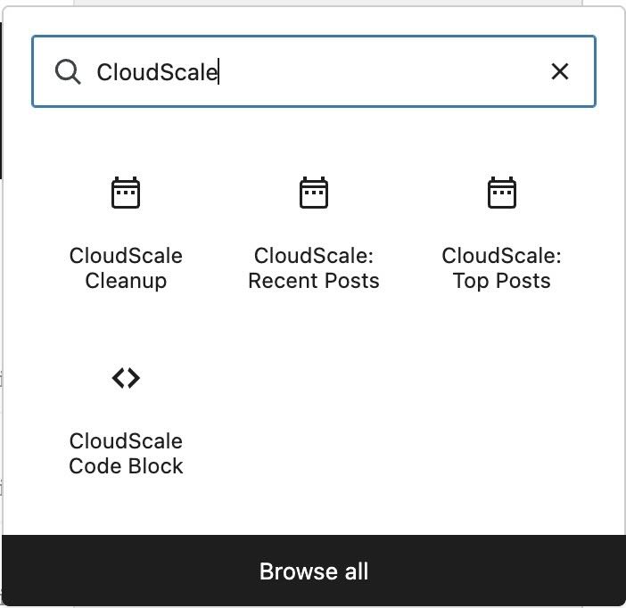 If your theme uses the block based widget editor, click the plus button in your sidebar area, search for “CloudScale”, and add the widget block.