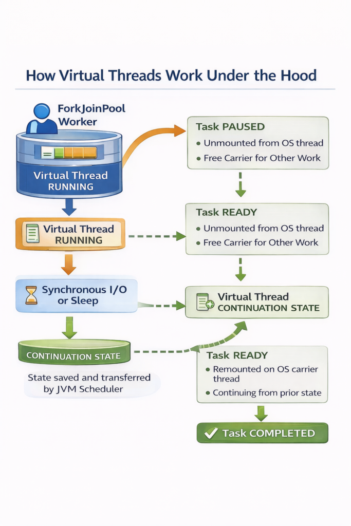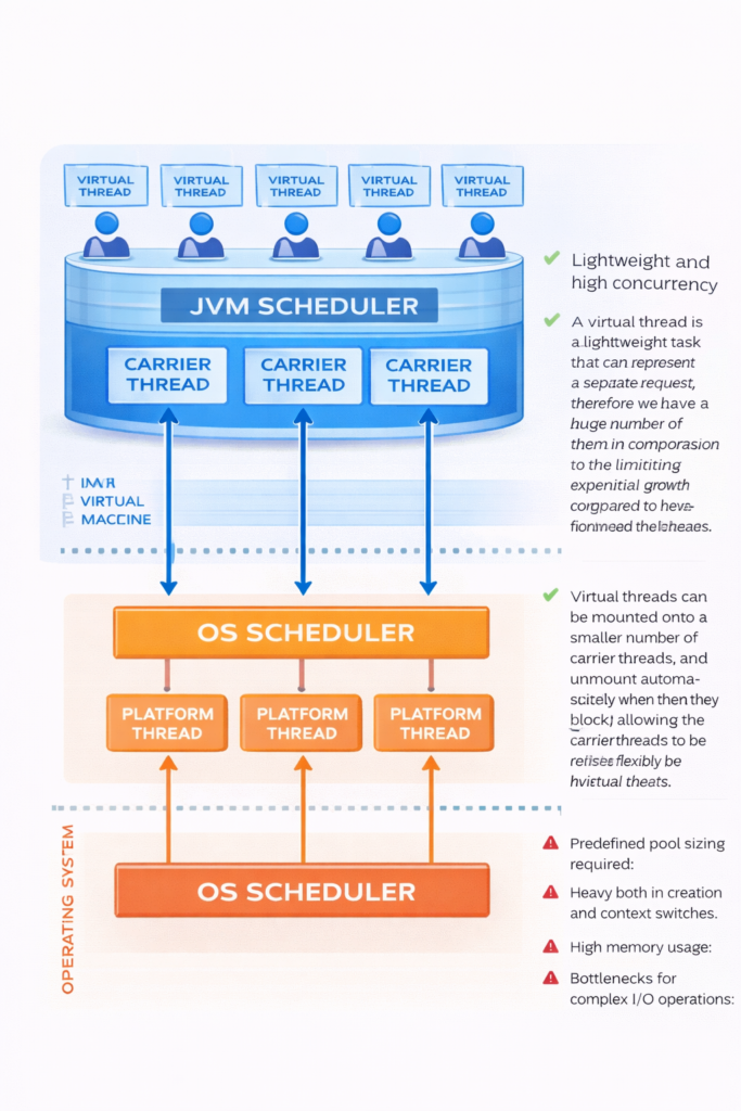 Virtual threads represent a paradigm shift in how we write concurrent Java applications. They enable the traditional thread per request model to scale to millions of concurrent operations without the resource overhead that plagued platform threads. Understanding virtual threads is essential for modern Java developers building high throughput, scalable applications.